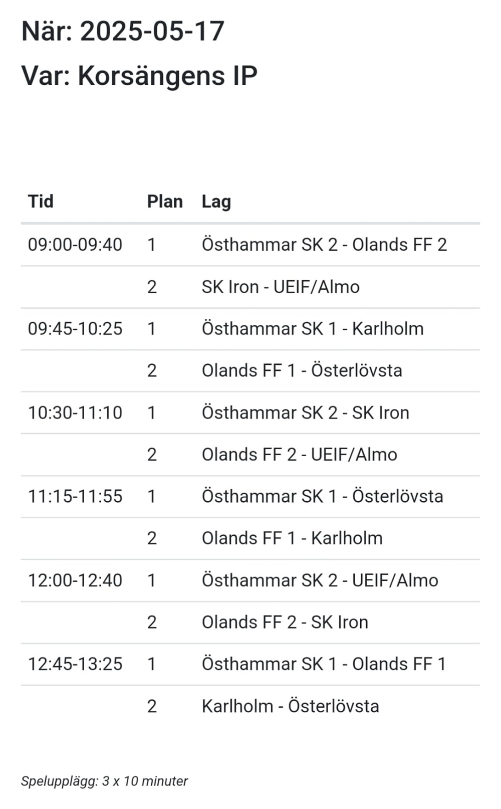 Sammandrag på Korsängens IP i Alunda lördagen den 17/5. Vi samlas där kl. 9.00 och har vår första match kl. 9.45 mot Olands (Alunda). Kom ihåg att spelarna behöver fylla på med energi under dagen för att få rätt förutsättningar att spela. Det kommer finnas en kiosk öppen med försäljningen av hamburger, korv, dryck och snacks.