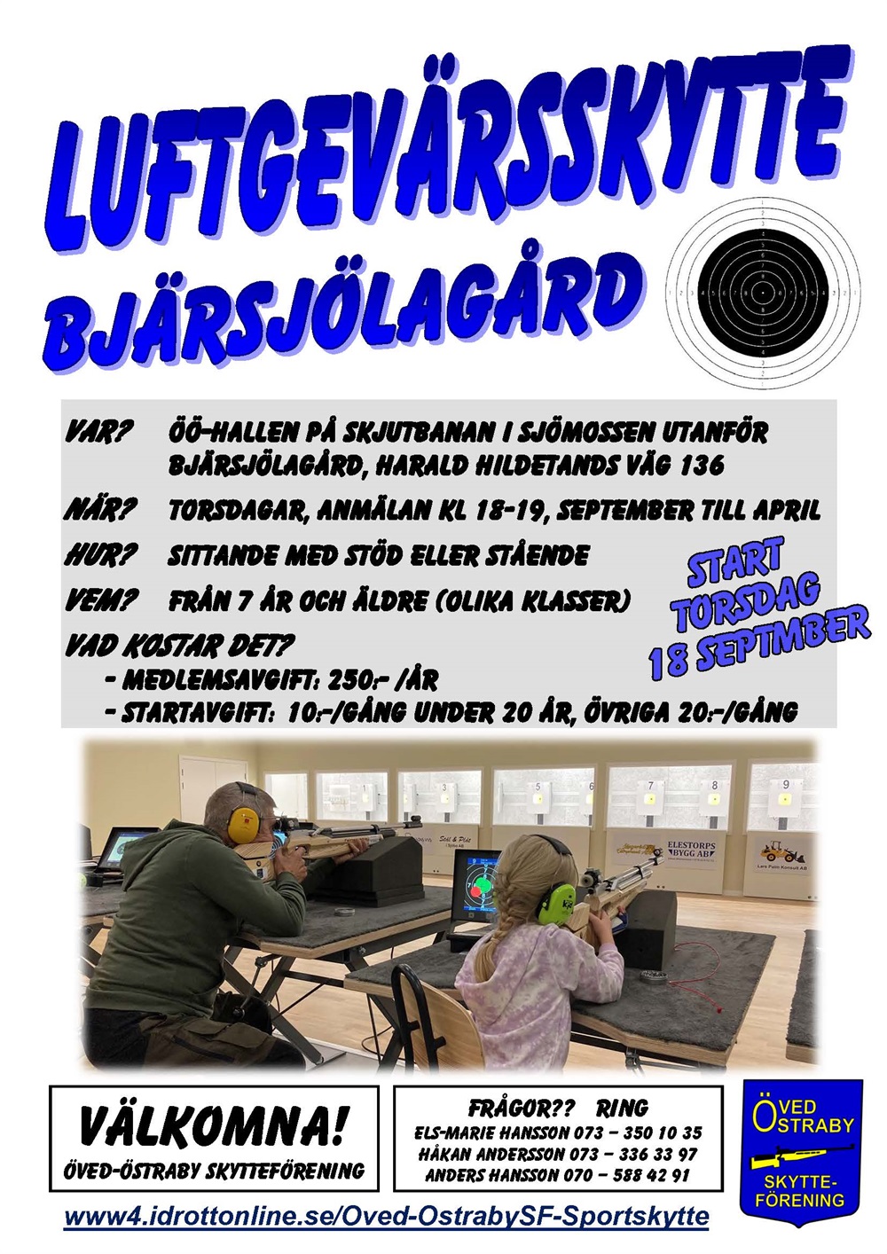 Luftgevärsskyttet startar för hösten 2025 torsdag 18/9. Anmälan kl 18 - 19 (upp t o m 20 år 18:00 - 19:00 och äldre 18:15 - 19:00). Program för luftgevärsskyttet torsdagar 2025 finns här.