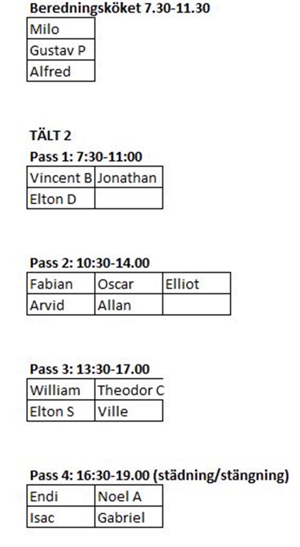 Vårt lag har i år blivit tilldelade att bemanna beredningsköket och tält 2. I år fick alla killarna varsitt pass under cupen, borträknat tränarnas respektive med undantag av Lina Stangenfjord som hjälper kiosk-/kökgruppen under cupen.
