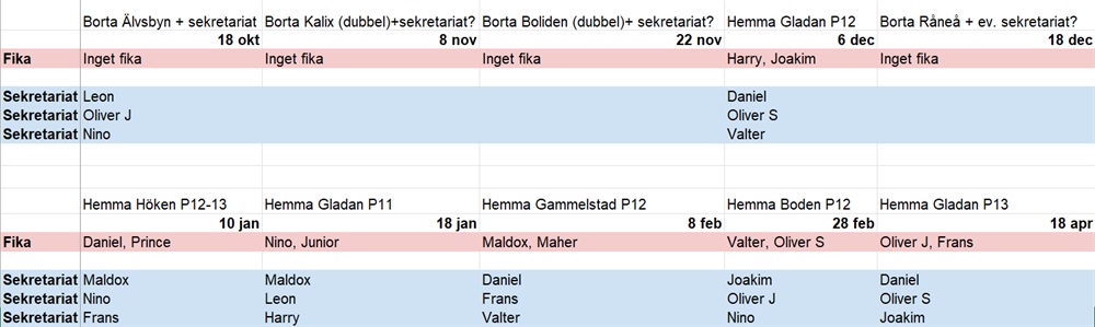 Här kommer en uppdaterad planering för vilka som ansvarar för fika och sekretariat under säsongen 25-26.