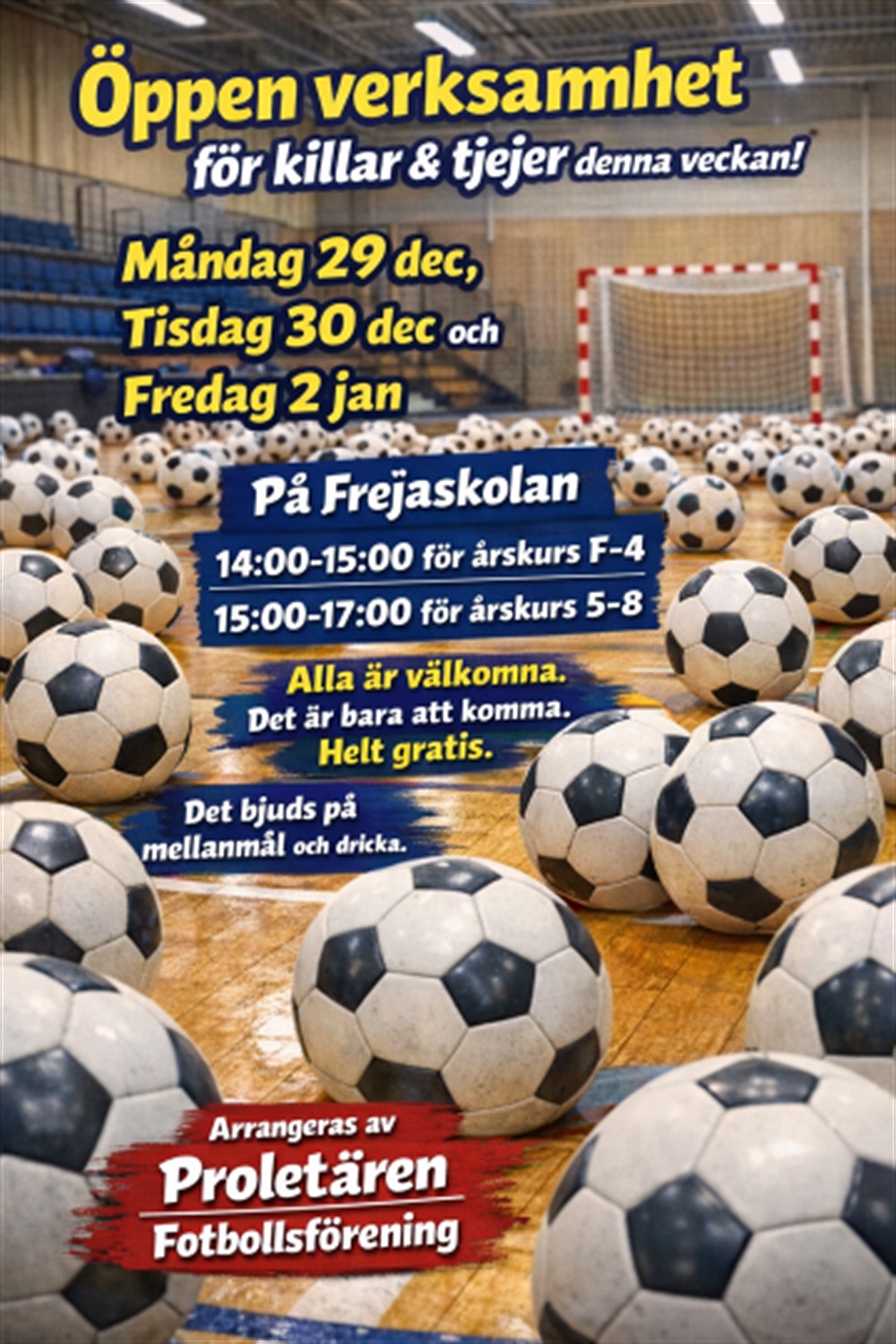 Välkomna till vår grymma öppna verksamhet på Frejaskolan. Låt oss fylla hallen även denna veckan och göra det roligast som finns. Sparka boll.
