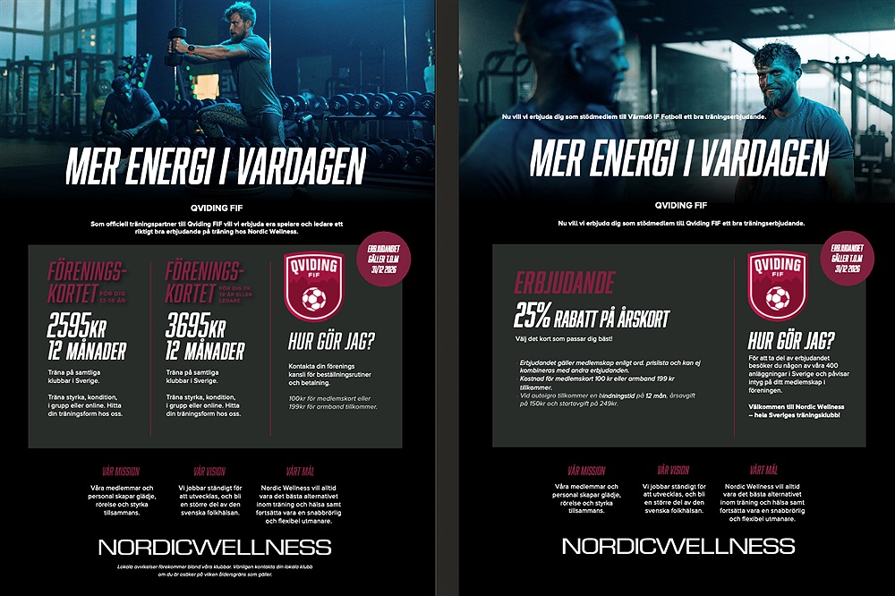 Du som spelar fotboll i Qviding FIF och är mellan 13-18 år gammal kan nu köpa medlemskapet Sverige för bara 2595 kr/år (ordinarie pris 7188 kr). För dig som är 19 år eller äldre och spelare eller ledare i föreningen är priset 3695 kr/år. Du får då fri tillgång till alla Nordic Wellness anläggningar i hela Sverige under ett helt år och kan på bästa sätt komplettera fotbollsträningen med dina individuella pass. Du beställer enkelt ditt medlemskap via föreningens kansli, enligt följande instruktion: