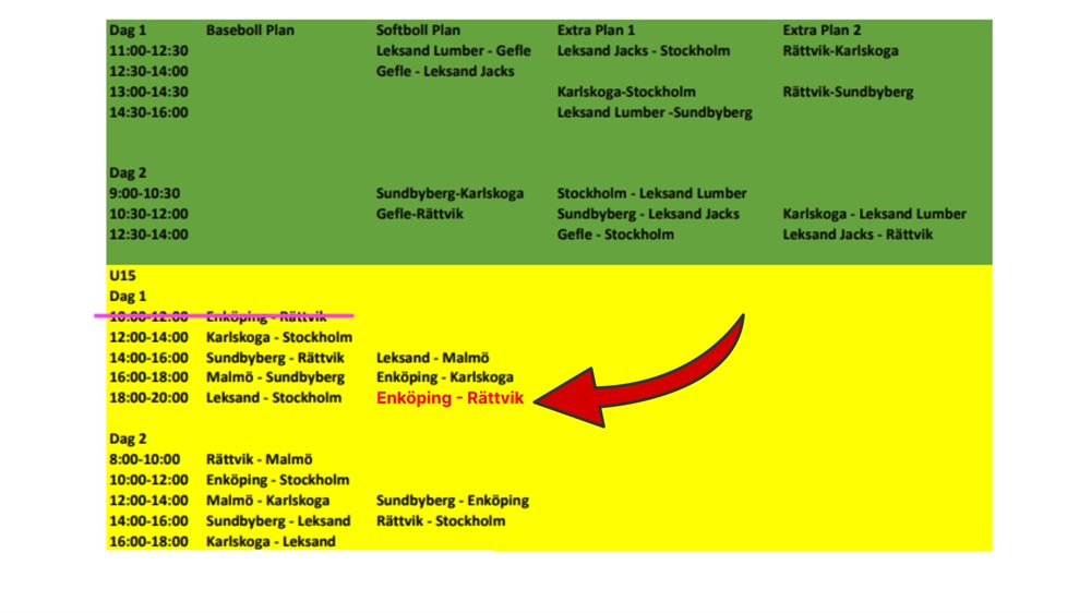 Se bifogat spelschema för både U12 (grönt fält) och U15 (gult fält).