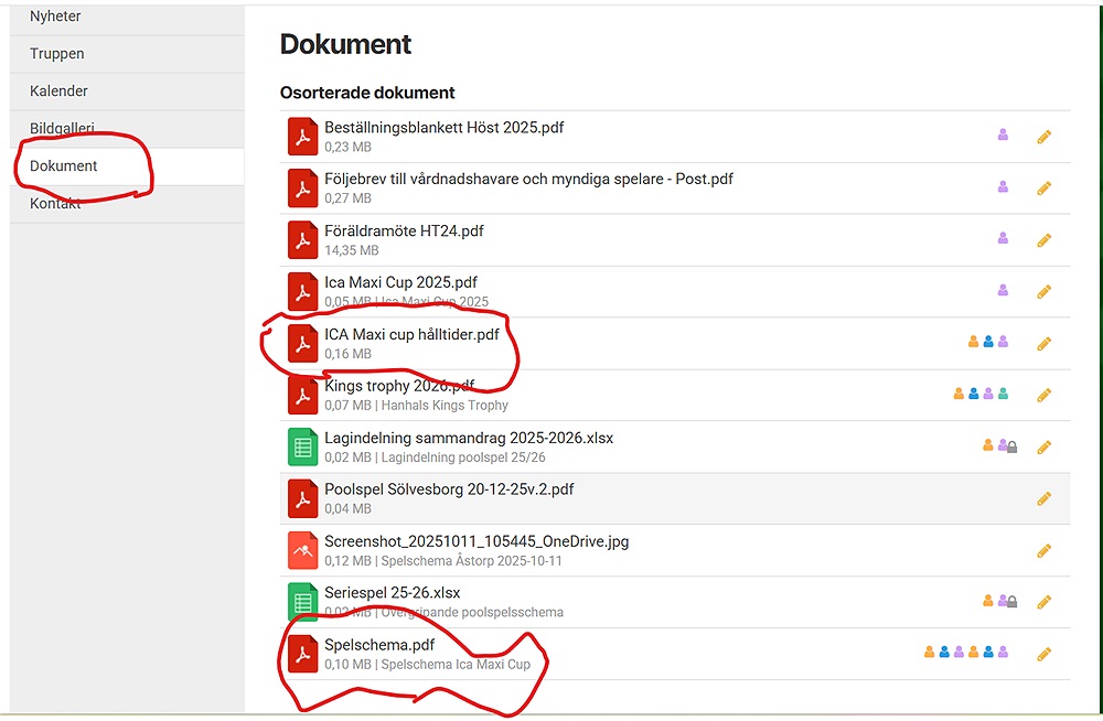 Hej, PDF filerna med informationsdokumentet och spelschemat försvann i förra utskicket. Men ni hittar de bland våra dokument. Se instruktion i bilden.