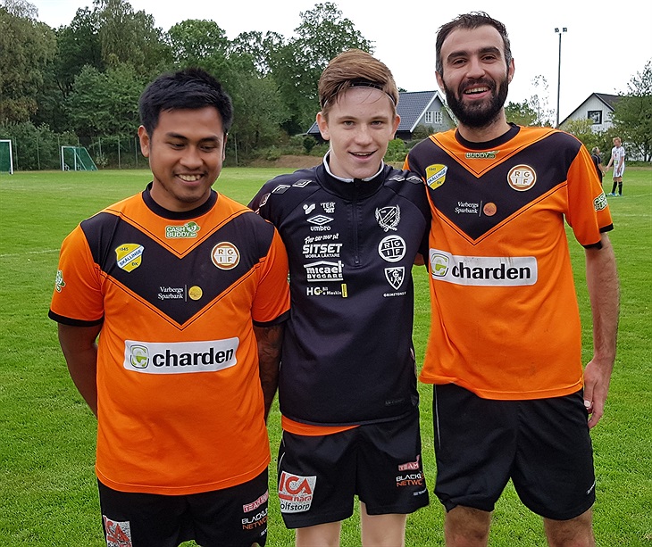 Två målskyttarna Chatchai Ratsameesomsri och Filip Malmgren och till höger fyramålskytten Abdullah Omar.