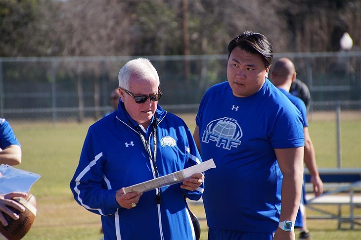 David Lee (höger) tillsammans med Coachen är Mike Berry och började coacha 1980 på University of Arizona. Senaste uppdrag va 2006-2008 då han coachade offensiva linjen för Detroit Lions. Bilden togs under IFAF Worldteam matchen i början av 2015.