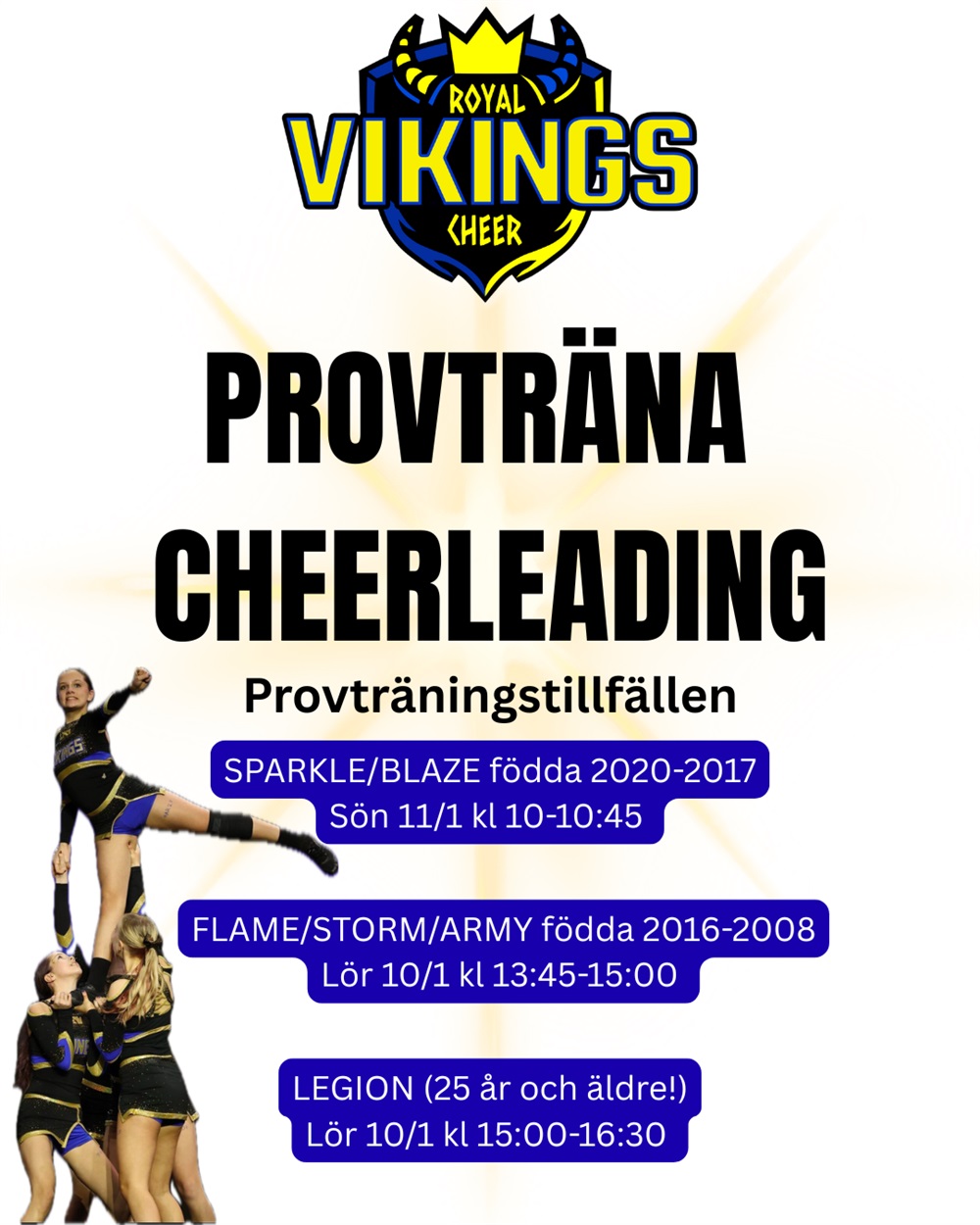 Är du nyfiken på att börja på cheerleading hos oss? Vi erbjuder nu provträningtillfällen för flera av våra grupper inför vårterminen. Välkommen att boka in dig till det tillfället som passar din åldersgrupp. Mer info om våra gruppen finns här.