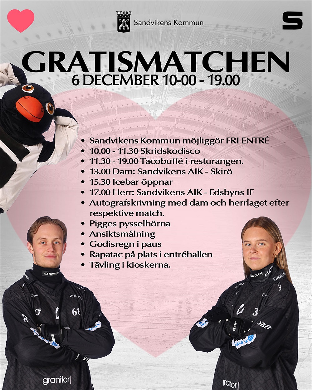 Tillsammans med Sandvikens Kommun bjuder vi in till en riktig bandyfest den 14 december. Det blir en dag med matcher för både dam- och herrlaget samt roliga familjeaktiviteter. Delta i skridskodisco och godisregn, eller passa på att träffa spelarna efter matcherna.