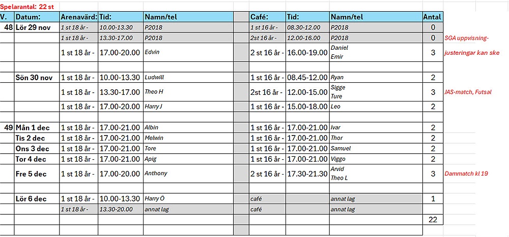 Färdigt schema - Arenavärd & Cafeteria (29 Nov - 6 Dec)