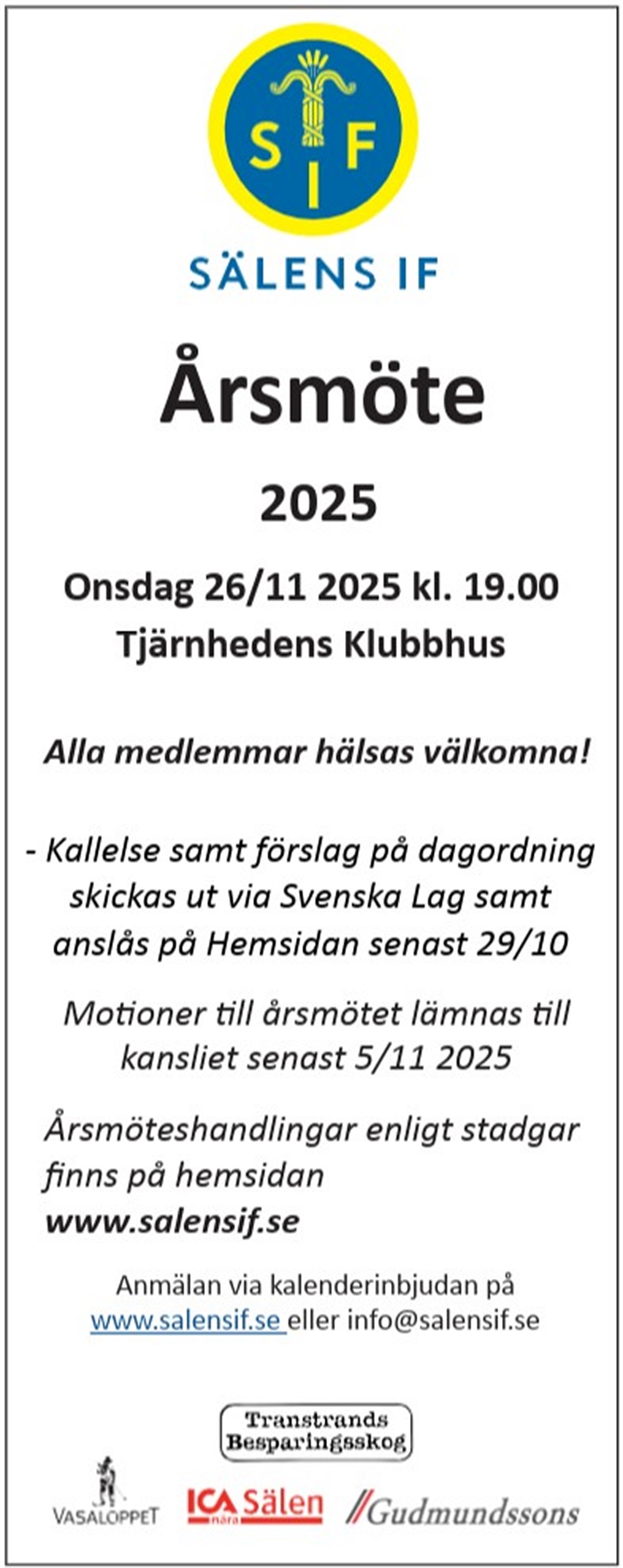 Sälens IF har idag ca. 1000 medlemmar, många aktiva inom någon eller några av våra åtta idrotter fördelat på våra sektioner. Navet i vår verksamhet utgår från vår fantastiska idrottsplats Tjärnheden, som erbjuder fina möjligheter till både ledarledd idrott och spontanidrott genom våra fotbollsplaner, hinderbana, utegym, och mycket mer. På Tjärnheden finns sommartid även en tempererad utomhuspool som ägs och drivs av Transtrands Besparingsskog.