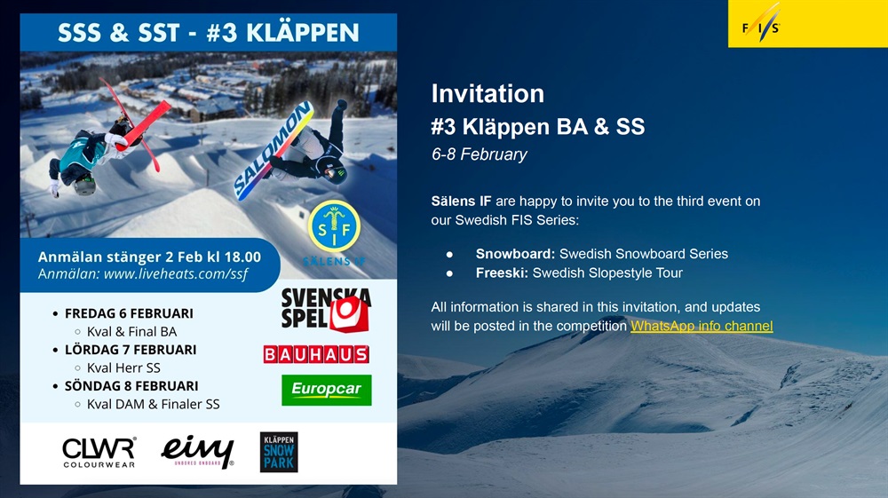 6-8 februari smäller det i Kläppen Snowpark med tredje stoppet av SSS & SST tävlingarna. Denna tävling är enbart en FIS tävling som kräver licens och för att söka licens måste du var minst 13 år.