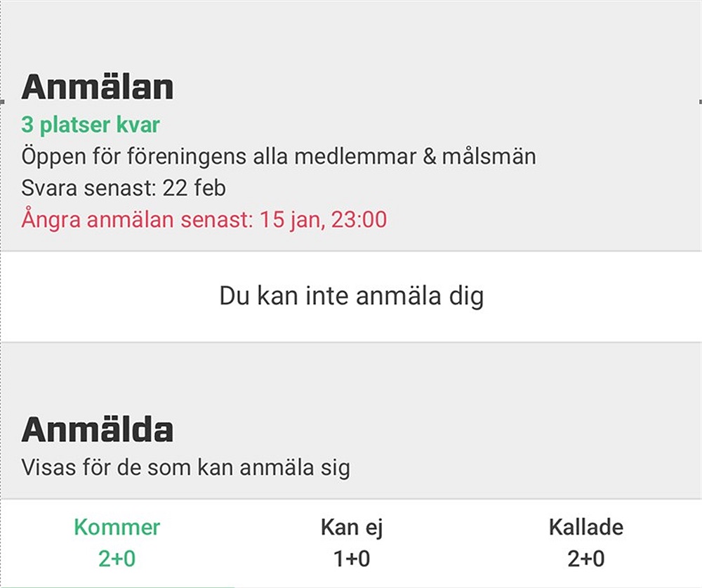 Vi har för närvarande ett tekniskt problem i svenska lag där man som medlem får upp "Du kan inte anmäla dig" när man klickar in på lediga pass. Detta verkar hända i flera olika kalendrar.