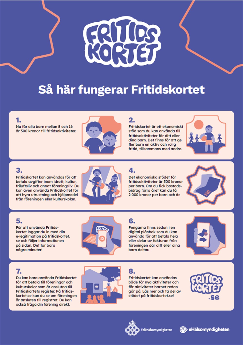 Det innebär att vårdnadshavare kan söka och använda Fritidskortet för att betala medlemsavgift och träningsavgift till föreningen om man har barn i åldern 8-16 år.