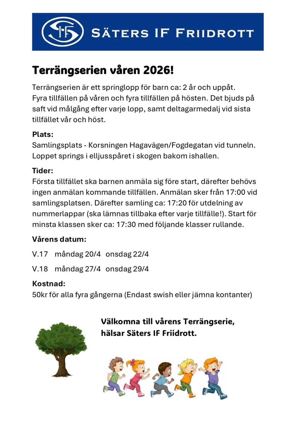 Stort tack för en fantastisk inomhussäsong både barn och vårdnadshavare. Nu väntar två veckor (v.17-18) med terrängserien i elljusspåret (mån+ons). Se info i bilden.