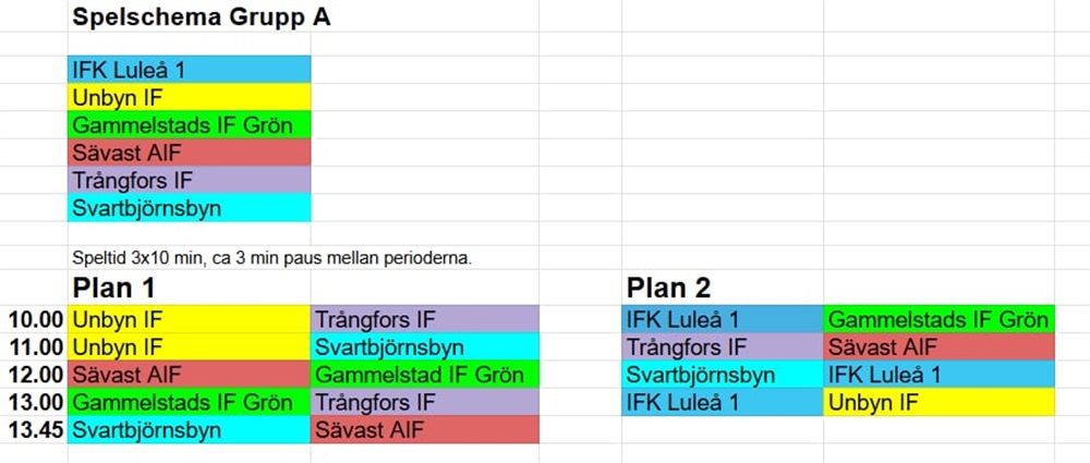 Hej, det kommer förmodligen bli lite regn så ta med regnjacka imorgon. Det blir också lite tätare i schemat då ett lag uteblir. Det här innebär att det kanske inte finns lika mycket luft mellan matcherna att äta osv men samtidigt blir vi då färdiga tidigare . Vår sista match blir förmodligen kl 13 som det ser ut nu