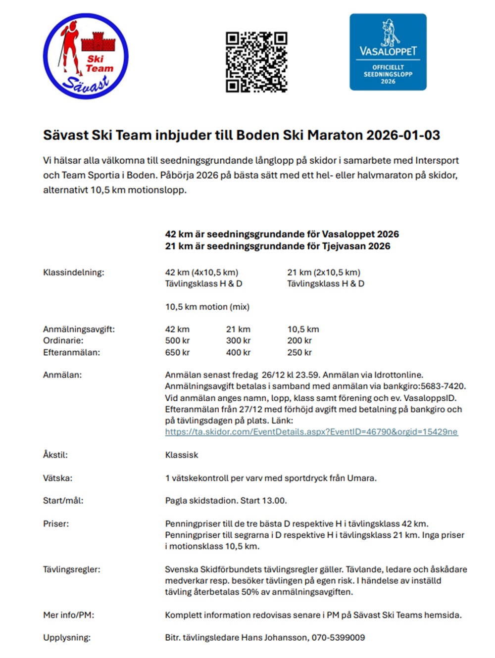 Lördagen den 3 januari 2026 kl. 13.00 går starten för årets första seedningsgrundande långlopp i Norrbotten. I den välkända Paglaterrängen åker de som tar sig an maratondistansen 4 varv på 10,5 km rundan. För de som vill åka en kortare distans finns halvmaran på 21 km eller 10,5 km.