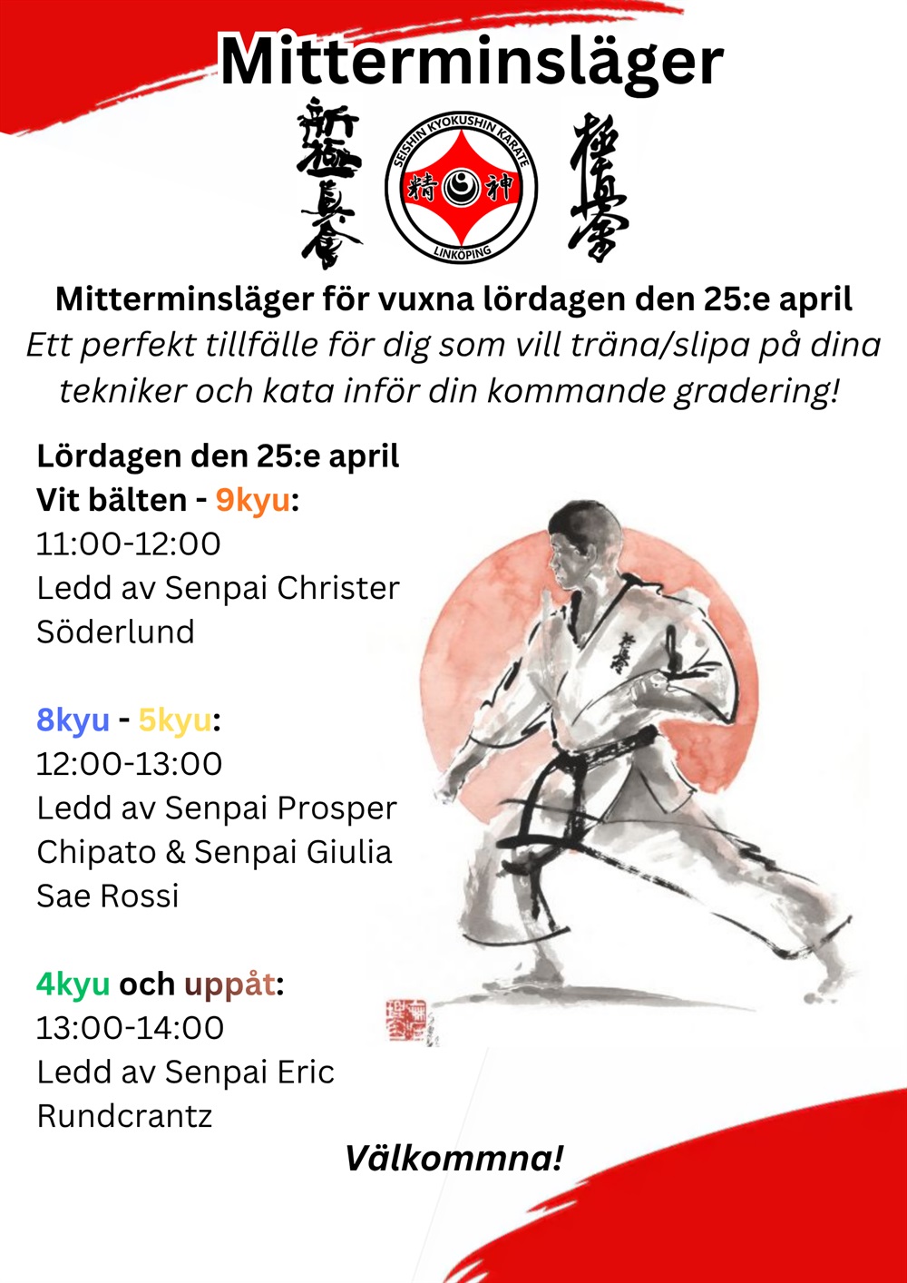 Lördagen den 25 april (nu i helgen) har vi istället för vår ordinarie träning ett mitt-termins-läger för klubbens vuxna tränande, i vår dojo på Snickaregatan. Lägret är en del av graderingsprocessen för vuxna, så att de som tänker gradera ska få en extra chans att öva på vad de behöver till sin nästa grad.
