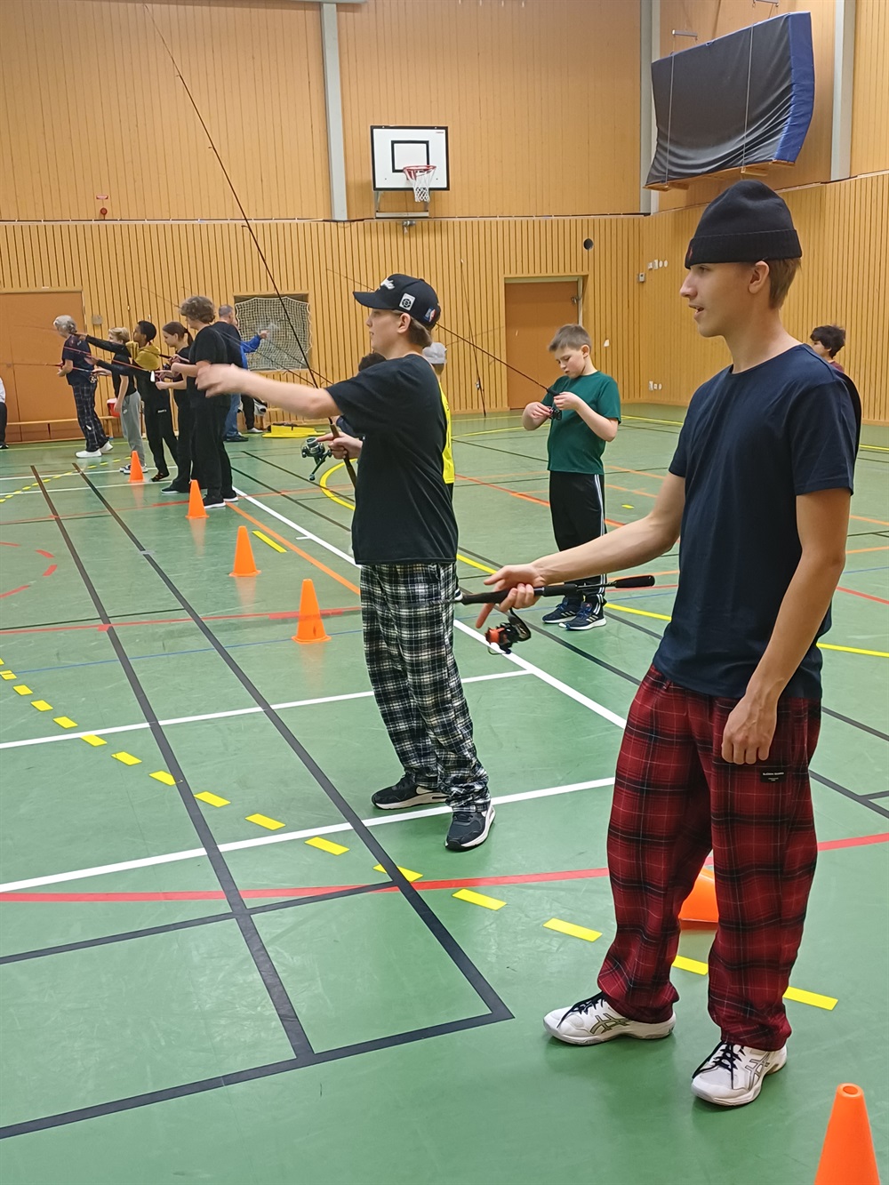 Vi har kul tillsammans och genomför olika kastövningar och tävlingar inomhus. Spön finns att låna.