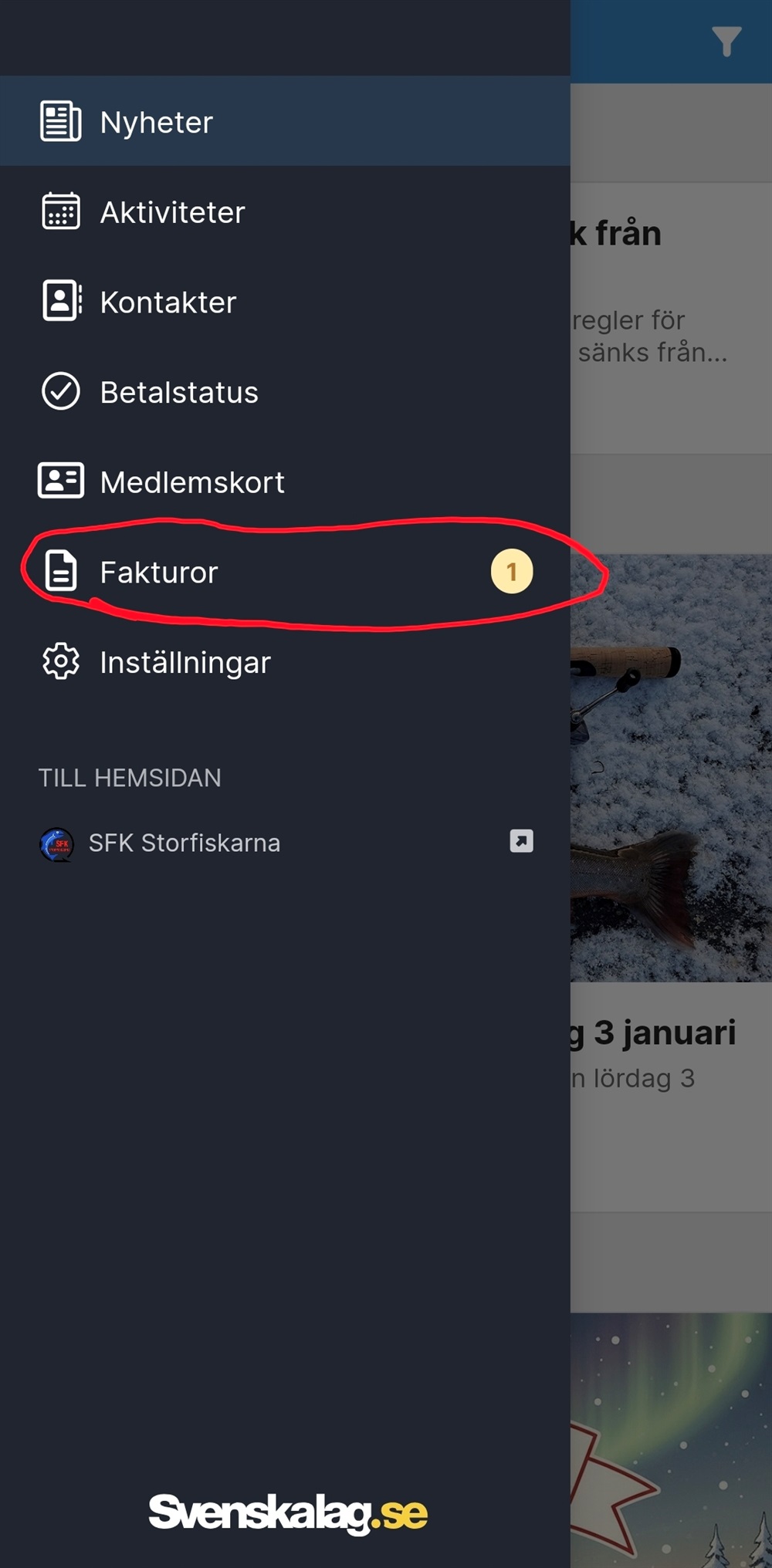 Så här ser sidan på svenska lag appen ut. Om ni klickar på fakturor, så kommer ni in och ser er faktura samt kan betala den.