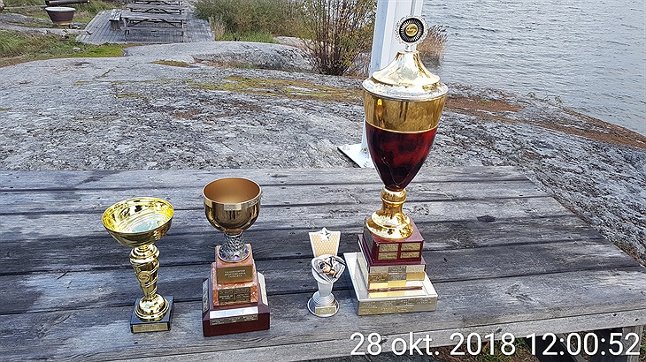Priserna som vi kämpade om under helgen 26-28 oktober 2018. Dom två pokalerna längst till vänster gäller största fisk och dom två till höger gäller mesta fisk.