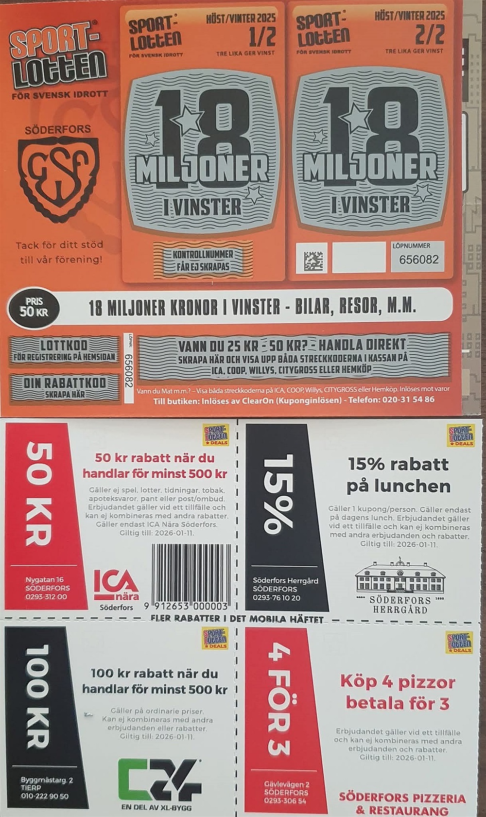 Med lotten följer rabattkuponger på Ica Nära Söderfors, Söderfors Herrgård, Söderfors Pizzeria och C24 i Tierp.