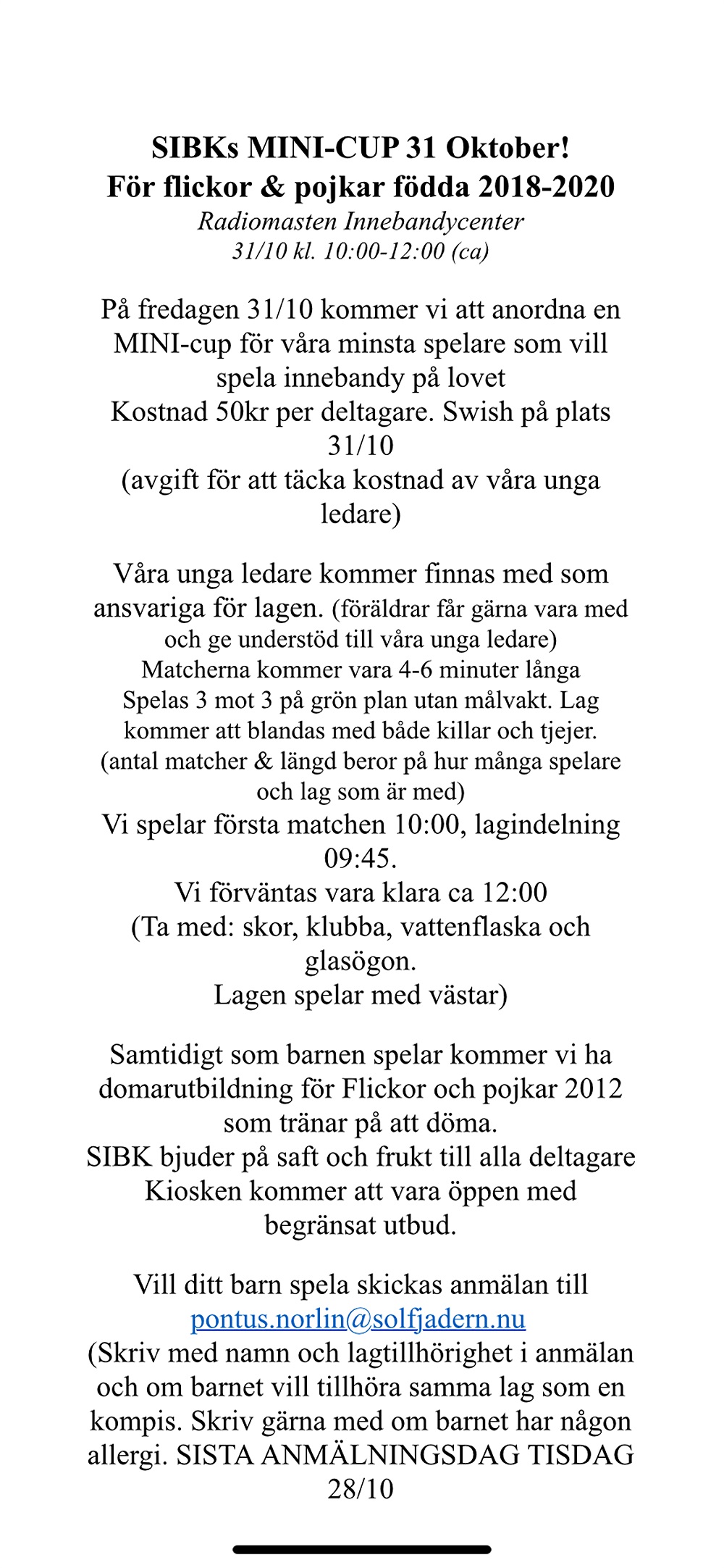 31/10 anordnar Solfjädern en mini cup för alla barn födda 2018-2020. Info ser ni här ovan. Kostnad 50kr/deltagare. Det är frivilligt att delta och vi ledare ansvarar ej för detta utan det är föreningen som anordnar.