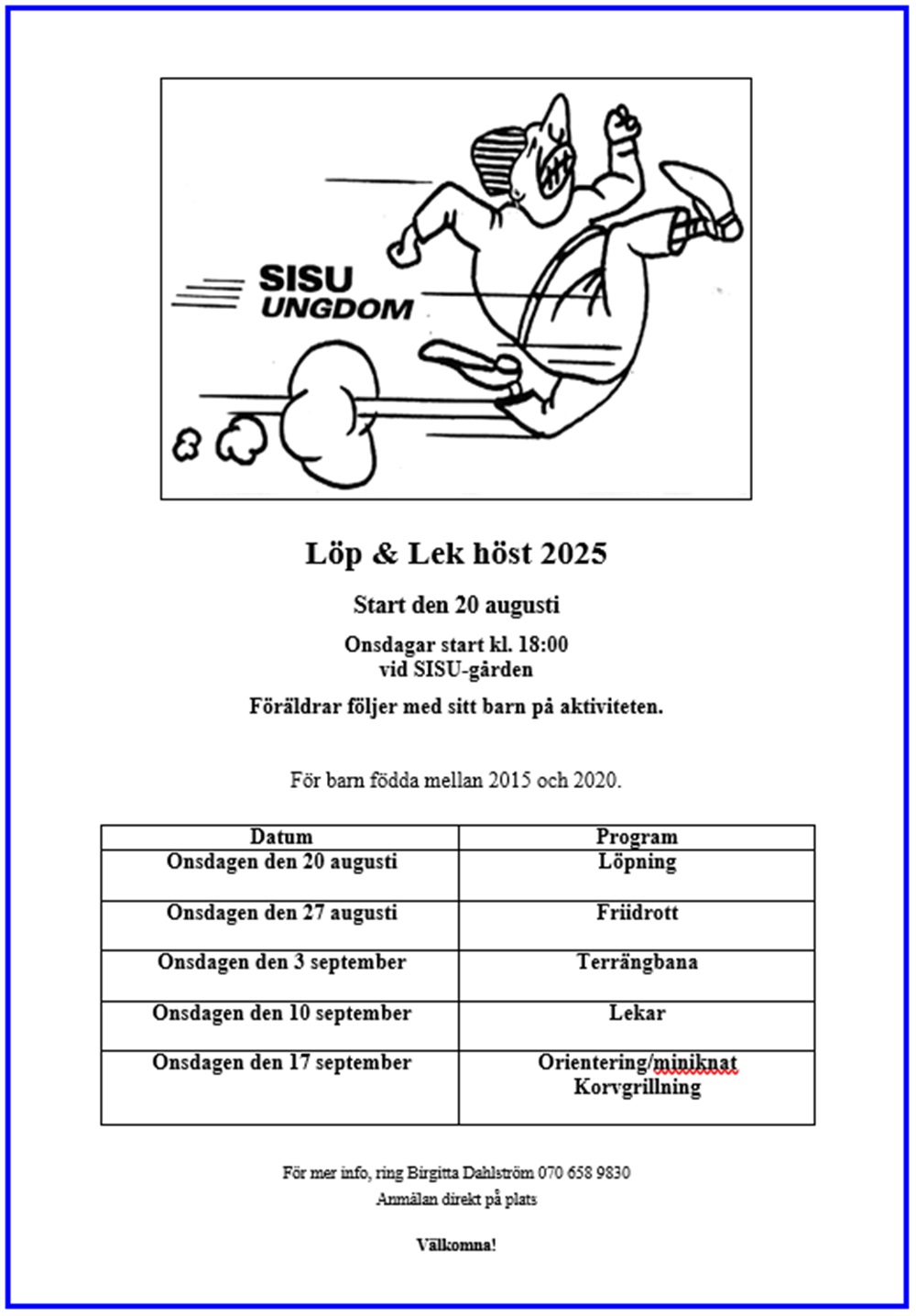 Startar onsdagen den 23 augusti kl 18.00 vid SISU-gården. Föräldrarna följer med sina barn på aktiviteten.