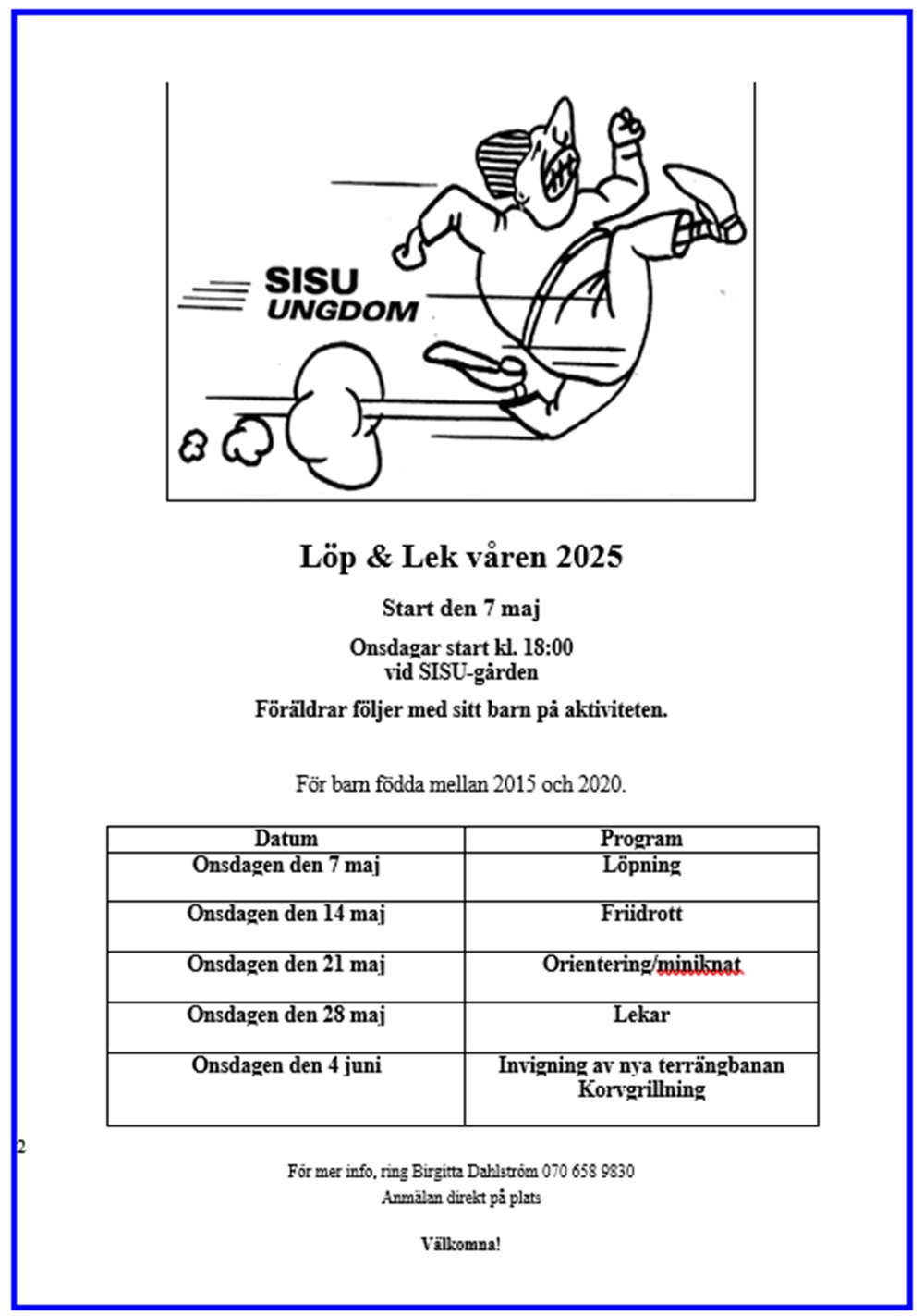 Startar onsdagen den 3 maj kl 18.00 vid SISU-gården. Föräldrarna följer med sina barn på aktiviteten.