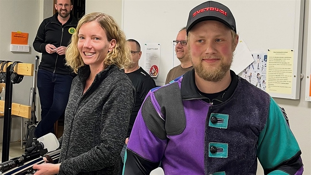 Finalisterna i 2025 års julcup luftgevär Linda Theodorsson och David Johansson klara för de tre finalskotten.