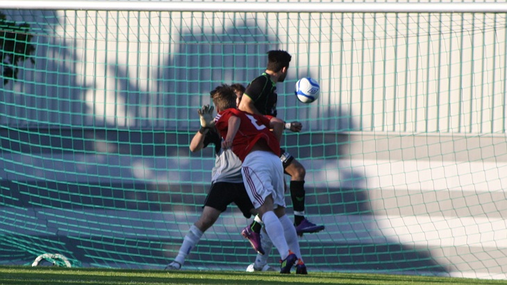Jocke P gör ett tappert försök att nicka in bollen.