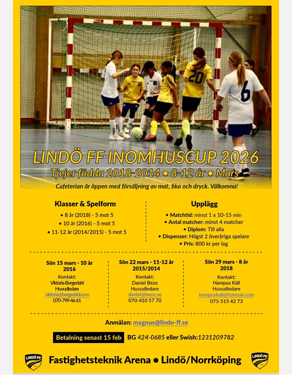 Den 29:e mars har vi anmält oss till Lindö FF inomhuscup i Norrköping. Detta gör att vi förlänger inomhussäsongen till hela mars. Cupen spelas mellan klockan 09-15, men dom skulle försöka att inte placera oss i en tidig...