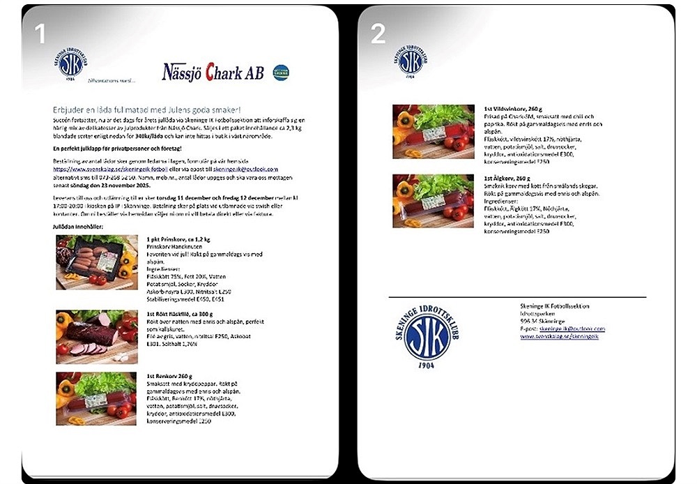 Hej! Påminner om Jullådan ifrån Nässjö chark. Lådan kostar 340kr. Försök att sälja några lådor för att stötta Skeninge IK fotboll. Vill ni beställa genom oss ledare så skicka antal till mig Sabina på 0706834079 senast 21/11.