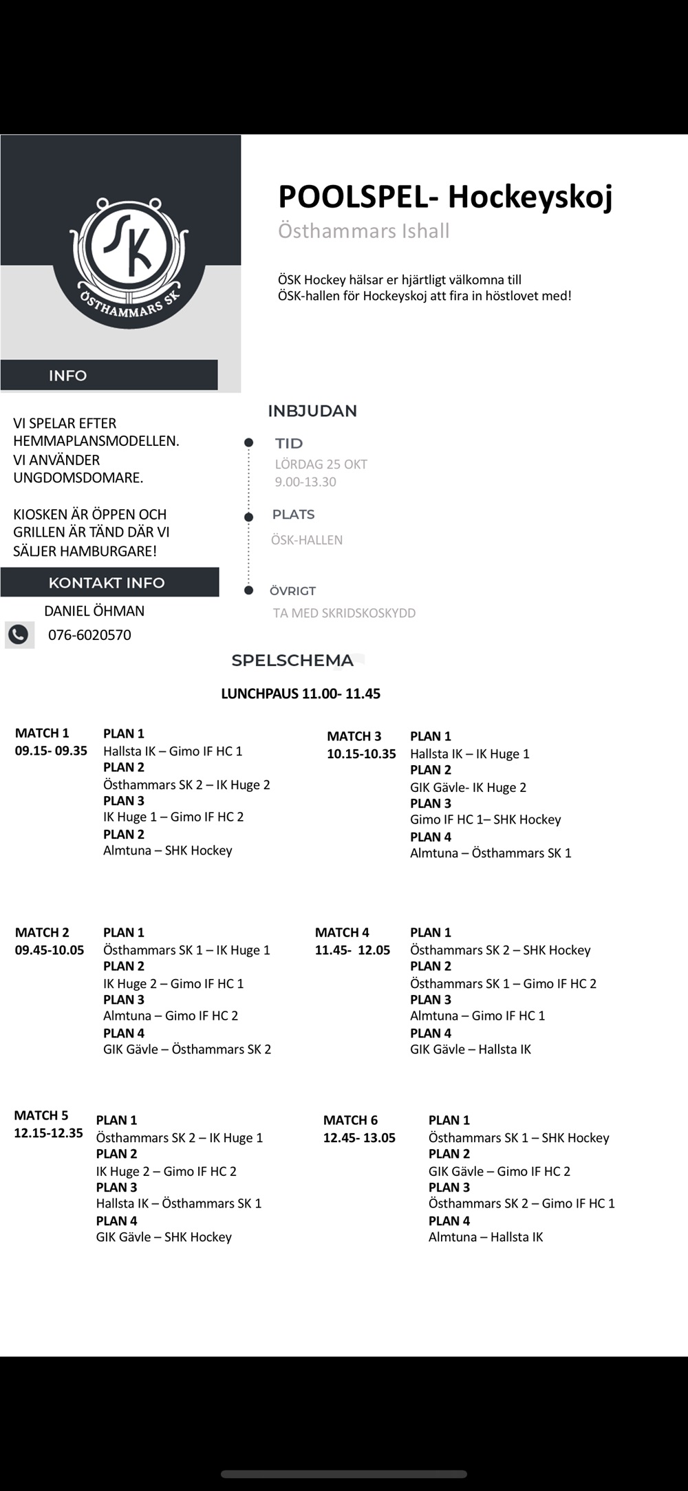 Vi har blivit inbjudna till Hockeyskoj i Östhammar den 25 oktober kl 9-14. Inbjudan gäller spelare födda 2018 och 2019. Yngre spelare får vänta till nästa säsong.