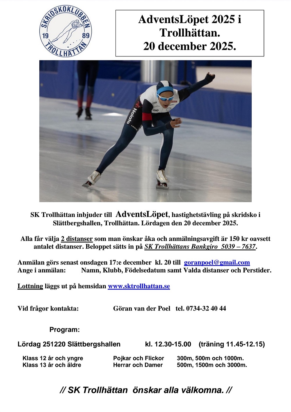 På lördag är det tävling, adventslöpet. Alla är välkomna att vara med. Perfekt för att prova på lite hur det är att tävla i skridskoåkning för er som inte gjort det förut. Tänker att vi kan öva lite på stor bana på träningen imorgon.