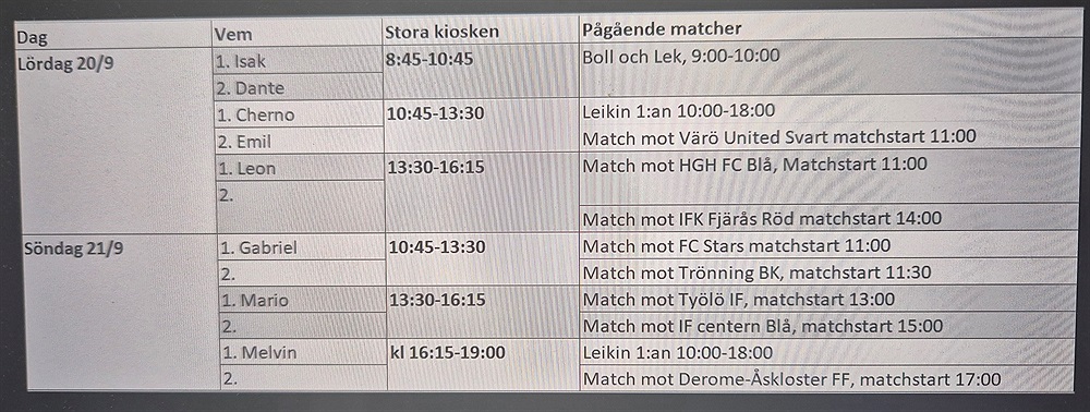 Hej föräldrar! Passen för kioskveckan(v 38) är klara och nu kan ni välja de tomma tiderna. Om det är för få som anmäler sig kommer vi att lotta ut tiderna. Ni som redan är uppsatta på pass får byta med någon annan om ni behöver. Ni byter mellan varandra och meddelar oss vem ni har bytt med. Omars mamma har redan vädjat om hjälp. Hoppas någon kan ställa upp för hennes skull! Hör av er till oss (först till kvar gäller för passen). Mvh Daniel och Dragana