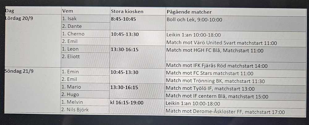 - Hej! Nu är schemat klart! Slumpgeneratorn har valt Nils Björk, Emin och Eliott som har fått pass som ingen tog frivilligt. Glöm inte att ni kan byta sinsemellan. Nyckel till lördagens första pass kan hämtas hos oss. Tänk på att det bara är stora kiosken vi håller öppen. Instruktioner för kiosken finns i svenskalag-dokument- rutiner och regler för kiosken. Lycka till! Mvh Dragana & Daniel