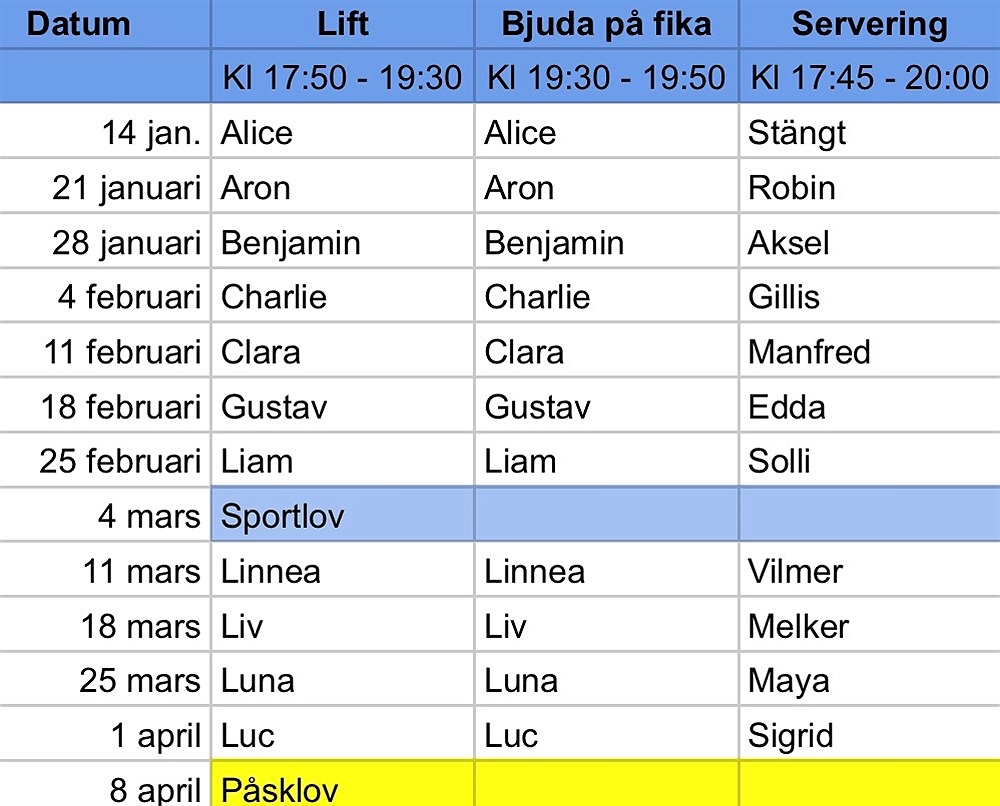 Skulle någon vilja byta serveringspasset 1 april. Skulle tro att vi missar den träningen då vi brukar åka till fjällen redan på onsdagen.
