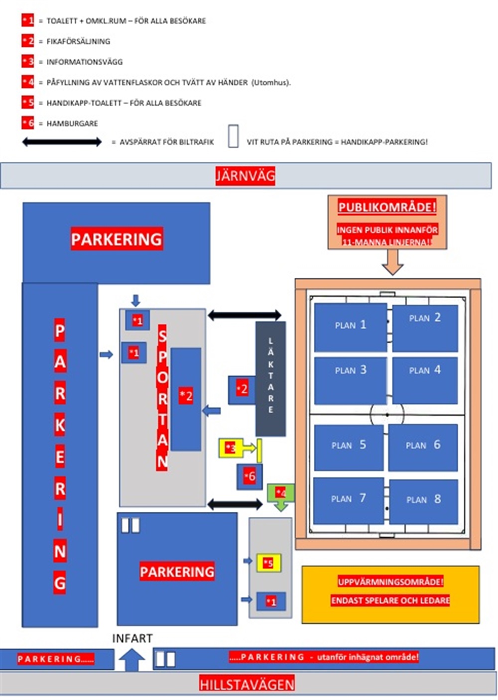 - Parkering sker på vår 7-manna plan, bredvid och utanför Sporthallen samt efter Hillstavägen