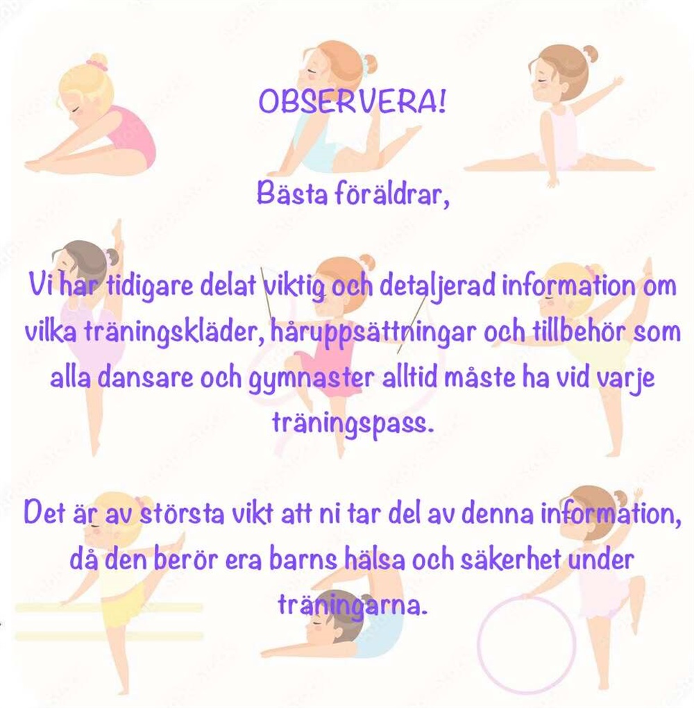 Bästa föräldrar, Vi har tidigare delat viktig och detaljerad information om vilka träningskläder, håruppsättningar och tillbehör som alla dansare och gymnaster alltid måste ha vid varje träningspass. Det är av största vikt att ni tar del av denna information, då den berör era barns hälsa och säkerhet under träningarna. [Länk till information om håruppsättningar] [Länk till information om kläder och tillbehör] Med vänliga hälsningar, GDK Stockholm STAR