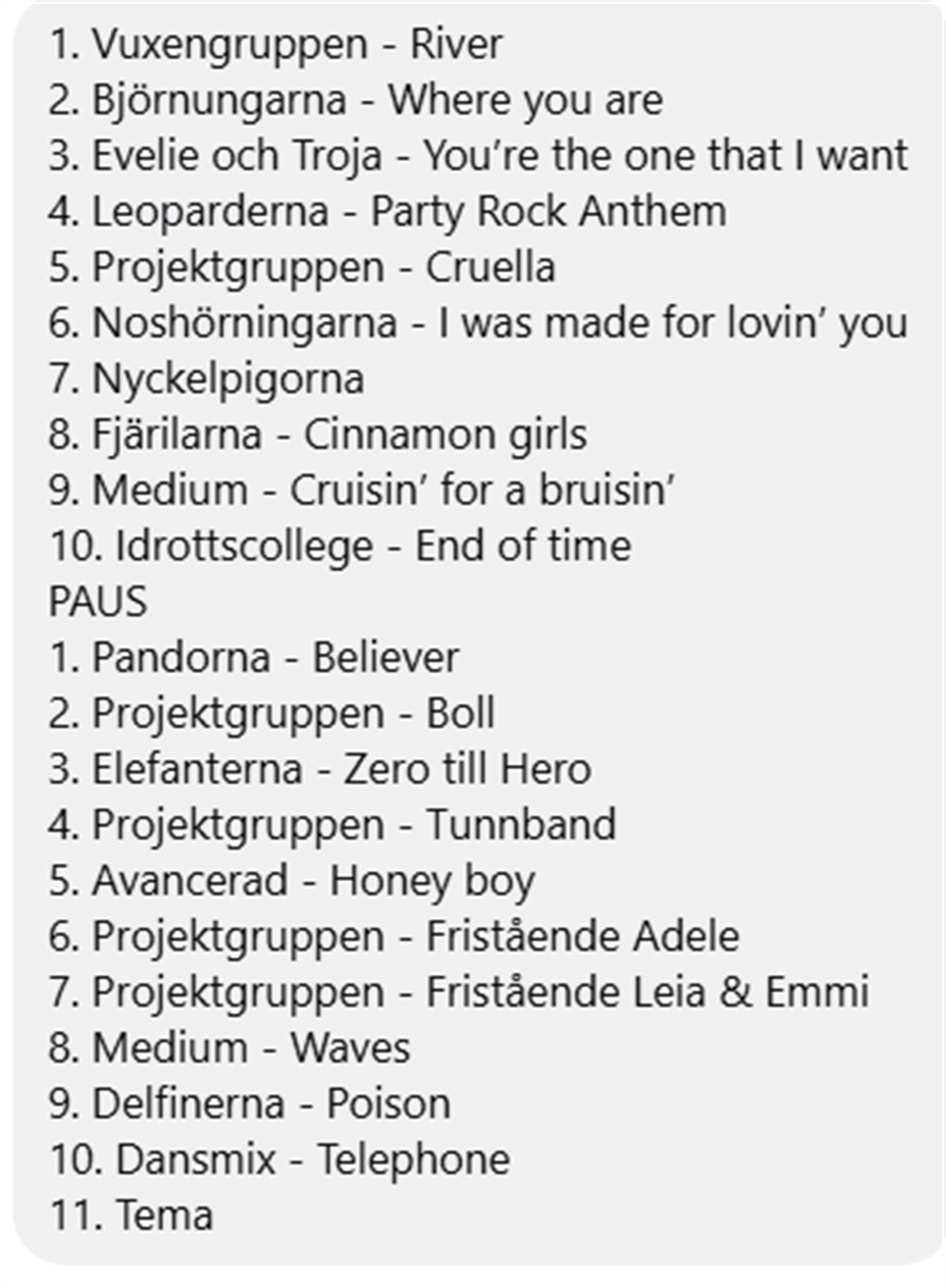 På bilden ser ni låtordningen/dansordningen för showen. Vår grupp heter Björnungarna och är med på Luciatåget (står inte med på bilden),