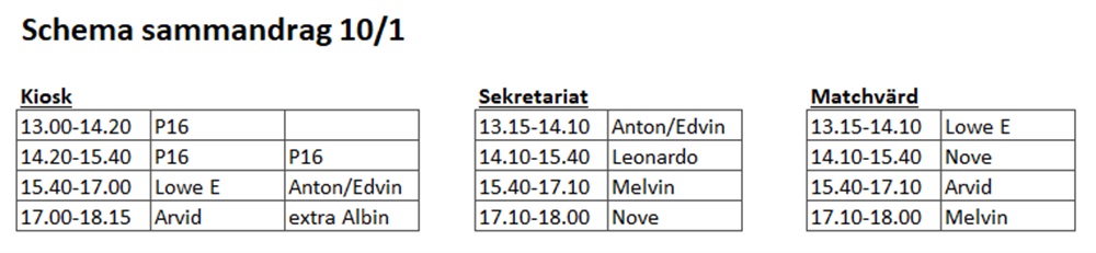 På lördag är det dags för sammandrag som vi arrangerar i Wahlbeckshallen. Här kommer schemat som gäller för bemanning av kiosk, sekretariat och matchvärd. Även P16 har sammandrag där då så vi delar på bemanningen av kiosken. Om ni gör några byten med varandra smsa Malin Eiderbäck på 070-401 47 57