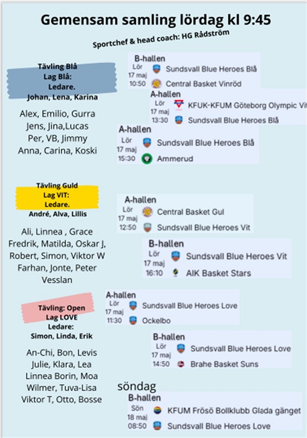 Här kommer spelschemat för lördagens matcher, Lag Love har även en planerad match på söndagen. Spelschemat för söndagen uppdateras efter lördagens resultat.