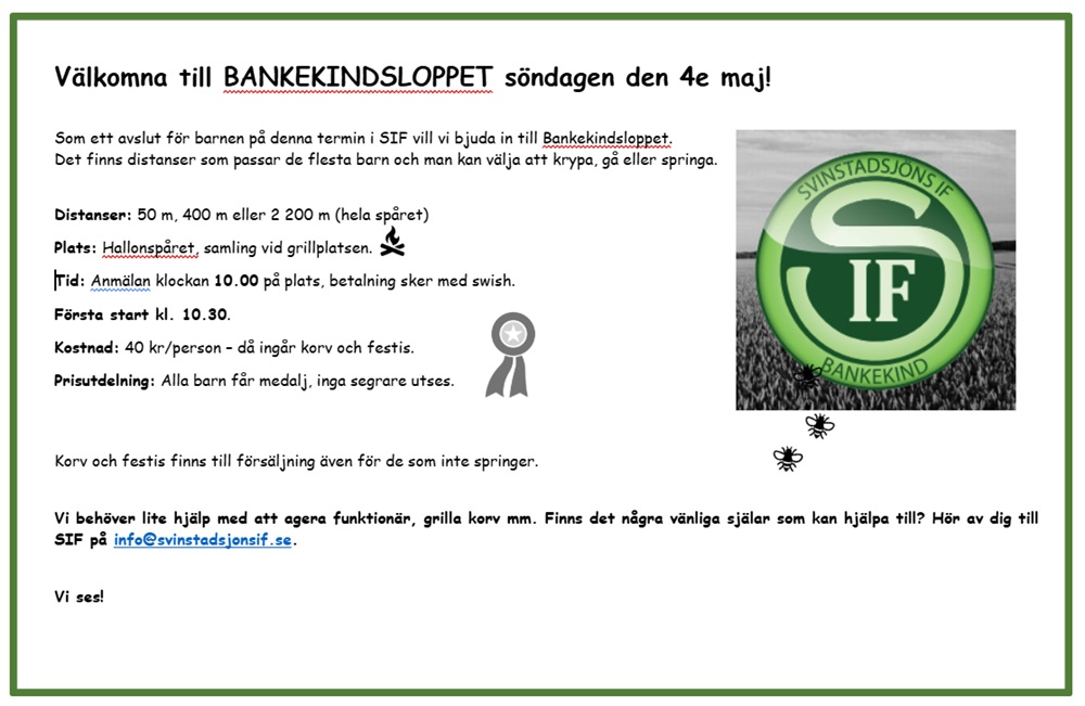 Gå gärna in och anmäl dig och ditt barn här: https://www.svenskalag.se/svinstadsjonsif/aktivitet/17655667/bankekindsloppet
