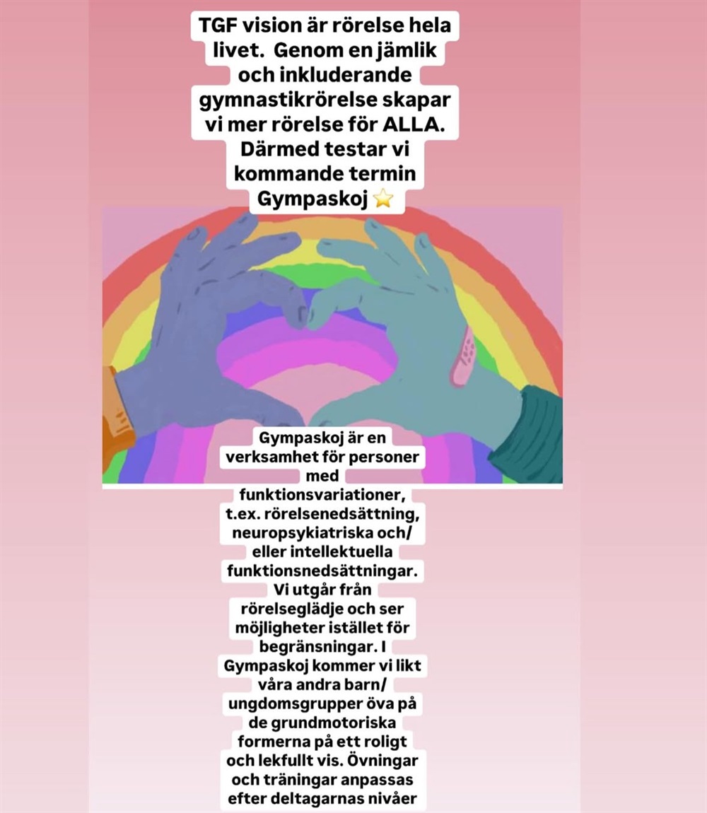- Vi tror på att erbjuda en gymnastikrörelse där alla känner sig välkomna och får möjlighet att delta oavsett bakgrund, behov och förutsättningar.