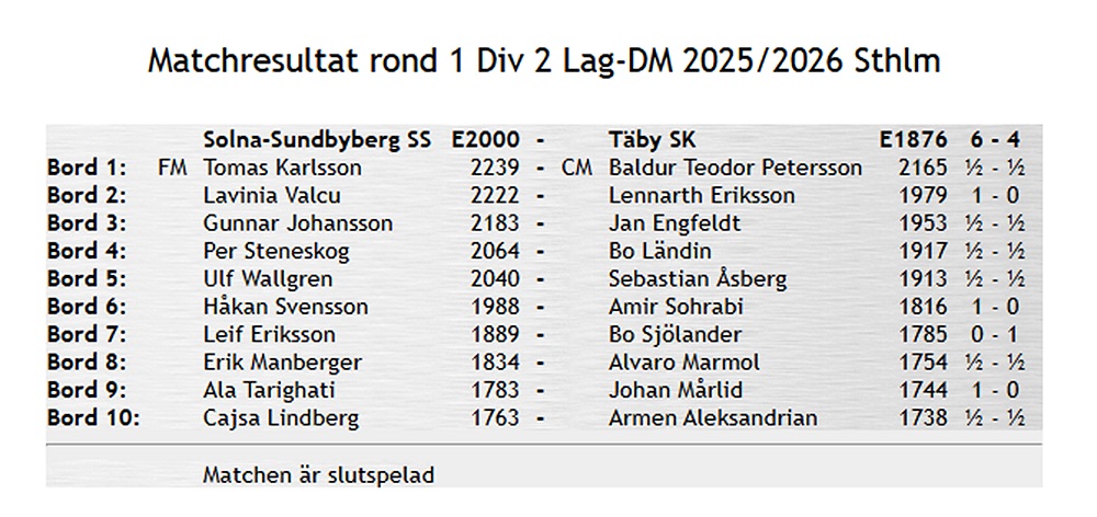 Min match mot Gunnar: jag fick öppningen dit jag ville och ett halvöppet mittspel. Han tvingades offra torn mot löpare för att undvika en snygg matt, men jag lyckades inte fullfölja. Slutade i dragupprepning och remi.