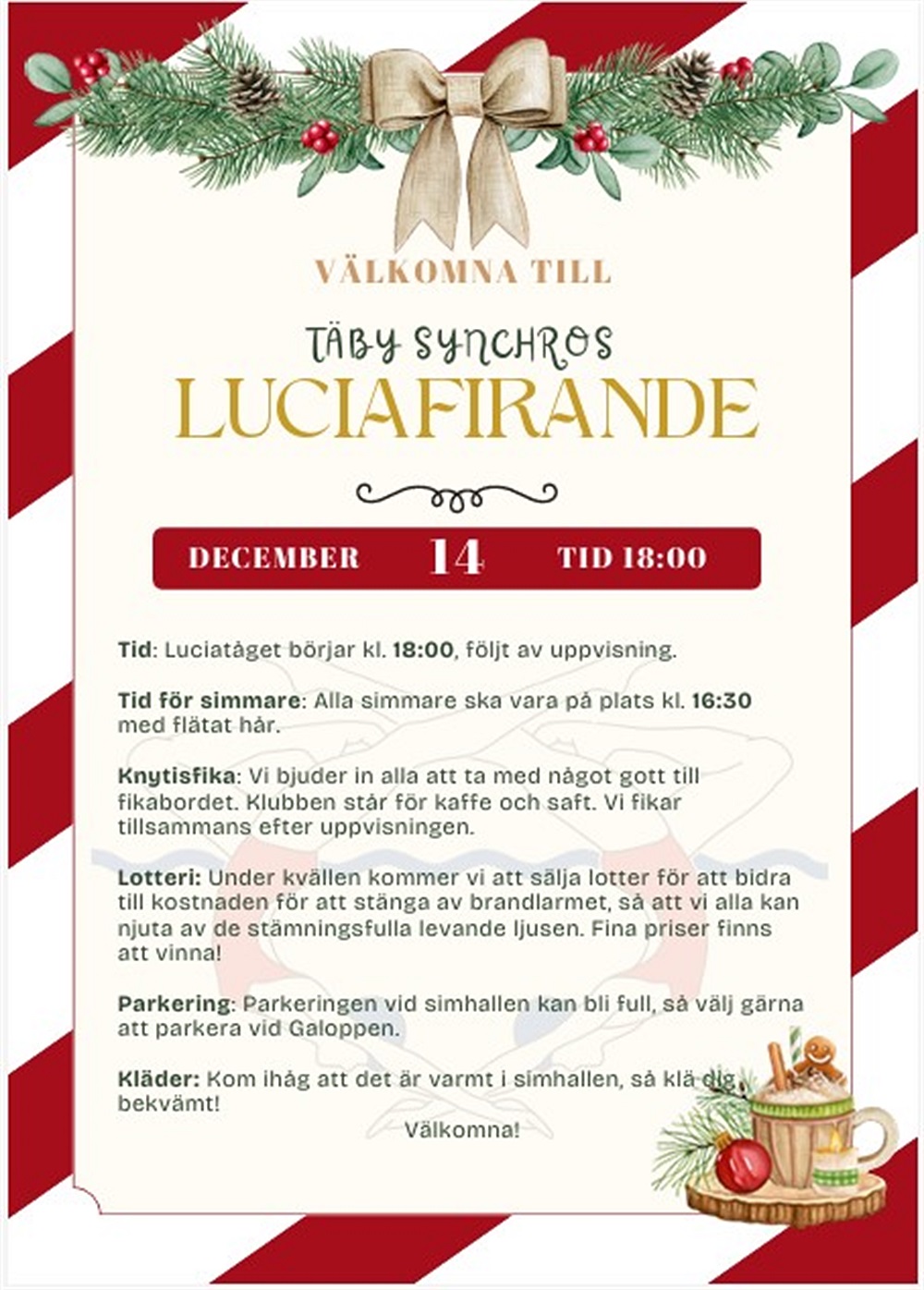 Täby Synchro är en föräldradriven konstsimsklubb med bas i Täby norr om Stockholm. Till oss är konstsimmare i alla åldrar välkomna, vi tar emot nybörjare i alla åldrar och har grupper på flera nivåer. Vår hemmabassäng är Täby Simhall. Viktigast för oss är att alla trivs och mår bra samt att vi tar hand om varandra både på träning och tävling. Hos oss finns några av Sveriges duktigaste konstsimmare, och definitivt de allra bästa tränarna!