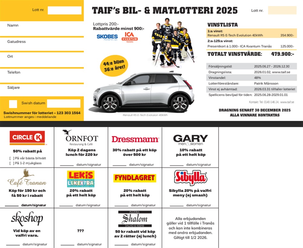 Vill du köpa en lott som julklapp eller till dig själv så är det dags nu! Hitta en säljare på stan eller swisha helt enkelt till lotteriansvarig Patrik Månsson så ordnar han hemleverans i Tranås. Bor du på annan ort kan vi skicka bild på din lott. Swishnummer är 073 98 46046, skriv billott och leveransadress som meddelande (glöm ej ev portkod). Lottpris 200 kr.