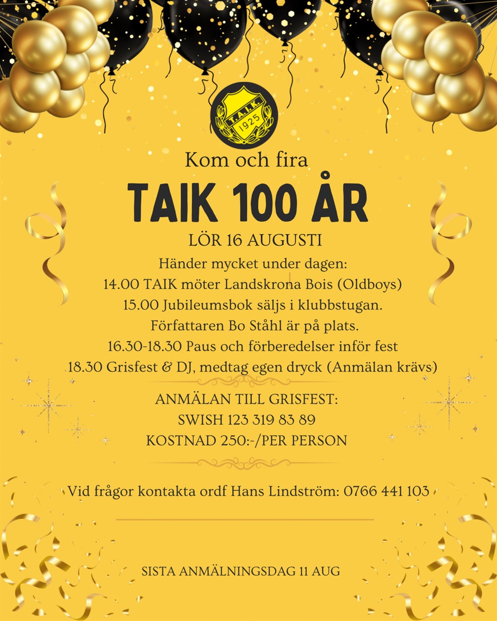 Lördagen den 16 augusti firar vi vår 100-årsdag med en tält och grisfest på vår idrottsplats. Vi har inga medlemskrav till festen utan alla som vill vara med och festa är välkomna. Men vi hoppas klart att många tidigare TAIK-spelare och ledare vill komma och fira vår födelsedag. Förutom festen på kvällen blir det på eftermiddagen en jippomatch mellan gamla Landskrona BoIS-spelare som får möta en TAIK-bilaga.