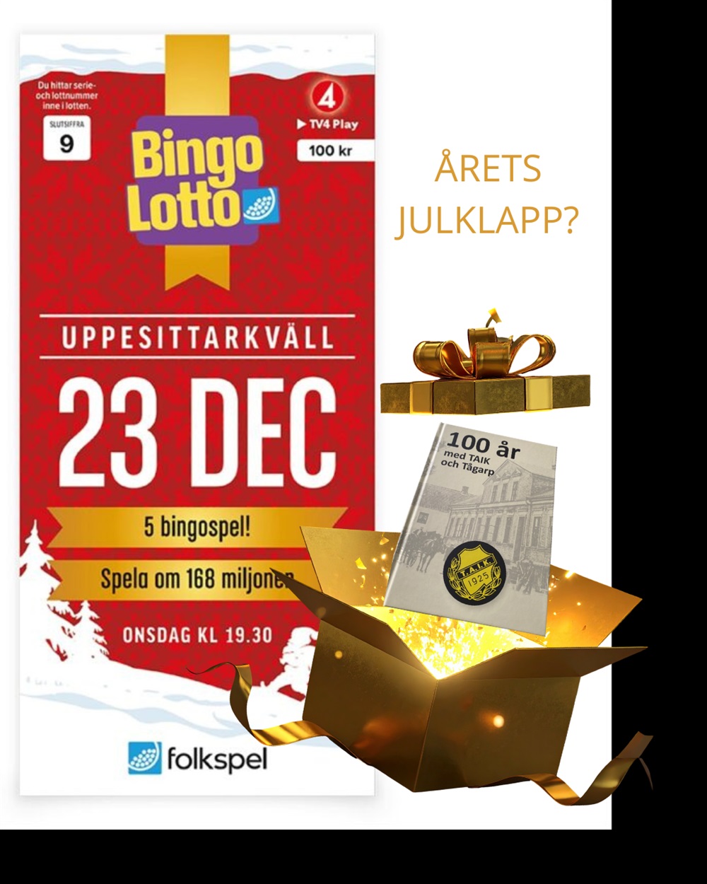 Tågarps AIK säljer som vanligt bingolotter till uppesittarkvällen den 23 december. Dem kan även detta år köpas hos vår samarbetspartner Backagrillen. Där kan man även köpa årets jubileumsbok om TAIK och Tågarp 100 år. En fin julklapp för alla i byn eller med lite koppling till Tågarps AIK eller själva byn.