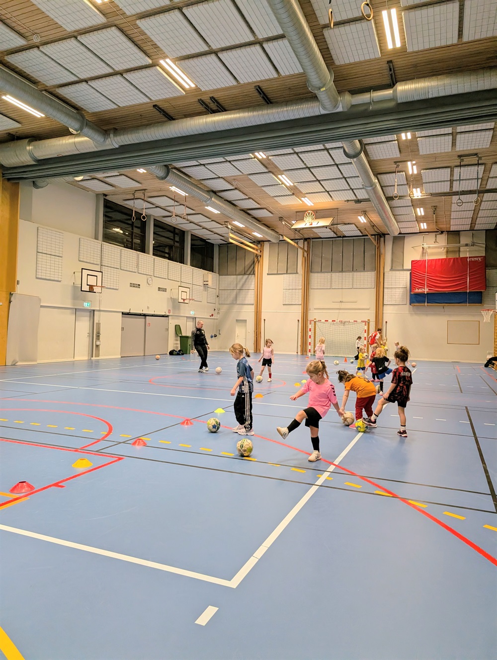 Uppvärmning med dansstopp och boll. Därefter en hinderbana med fokus på bollkontroll och skott på mål. Sedan övade vi på pricksäkerhet genom att skjuta ner koner, spelade match och avslutade med leken "Vem är rädd för Zlatan."